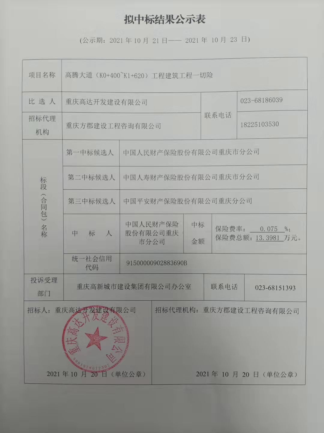 高腾大道(K0+400~K1+620)工程建筑工程一切险拟中选公示