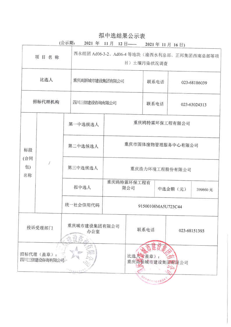 西永组团Ad06-3-2、Ad06-4等地块(渝西水利总部、正邦集团西南总部等项目)土壤污染状况调查公开比选拟中选结果公示