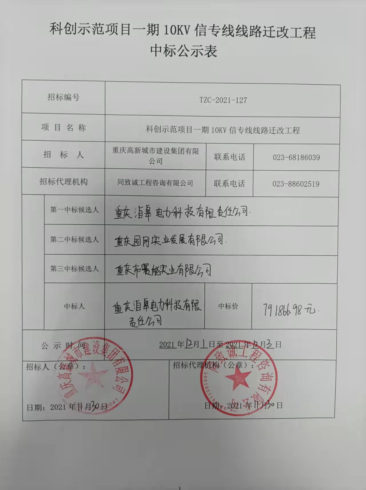 科创示范项目一期10KV信专线线路迁改工程中标公示表