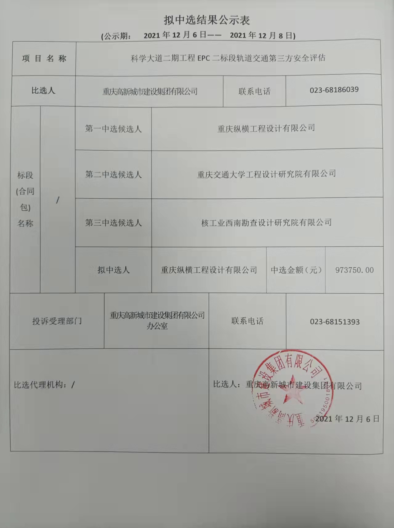 科学大道二期工程EPC二标段轨道交通第三方安全评估拟中选结果公示表