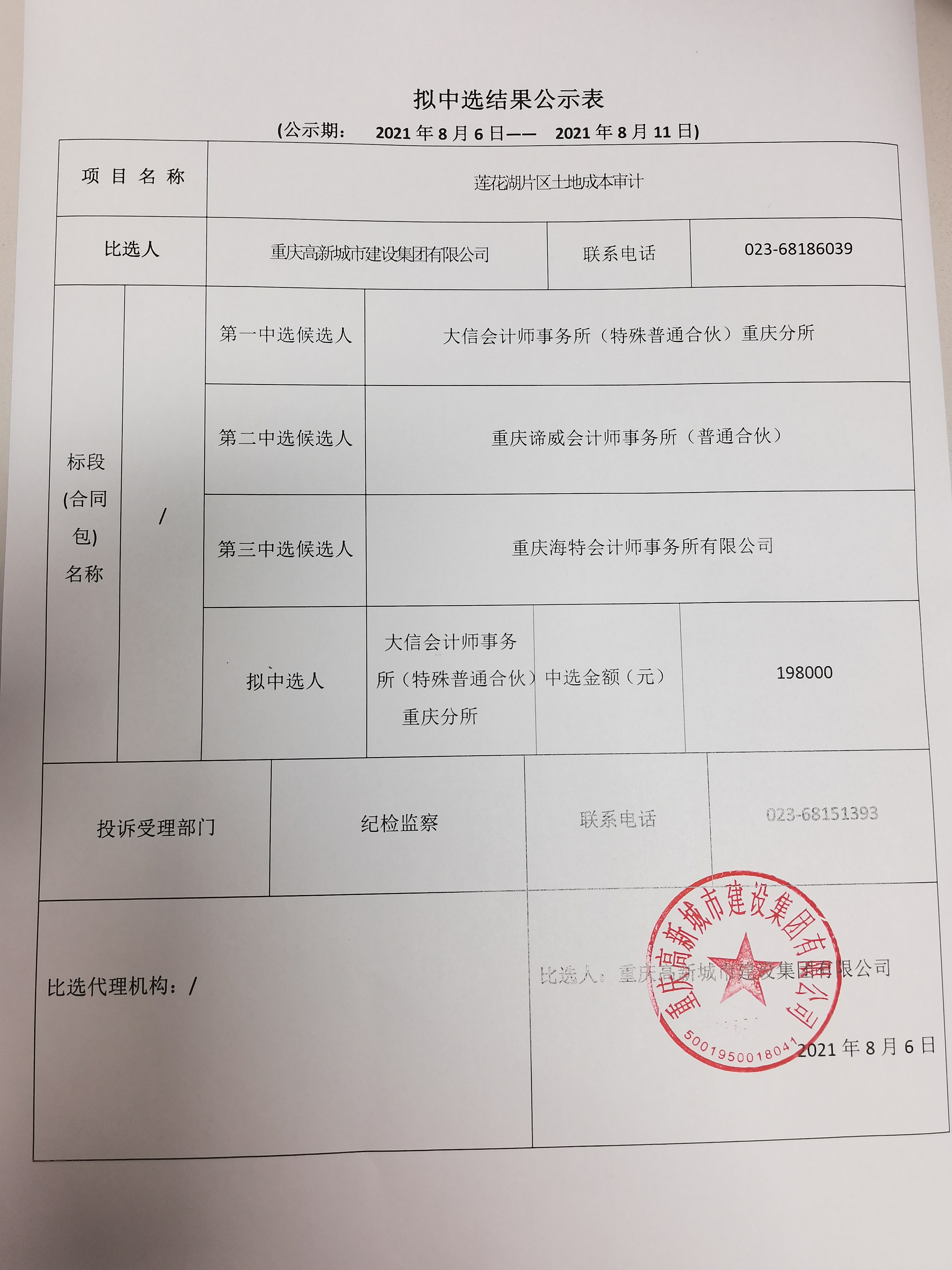 莲花湖片区土地成本审计邀请比选中选结果公示