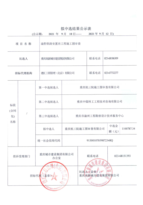 渝黔铁路安置房工程施工图审查中选结果公示表