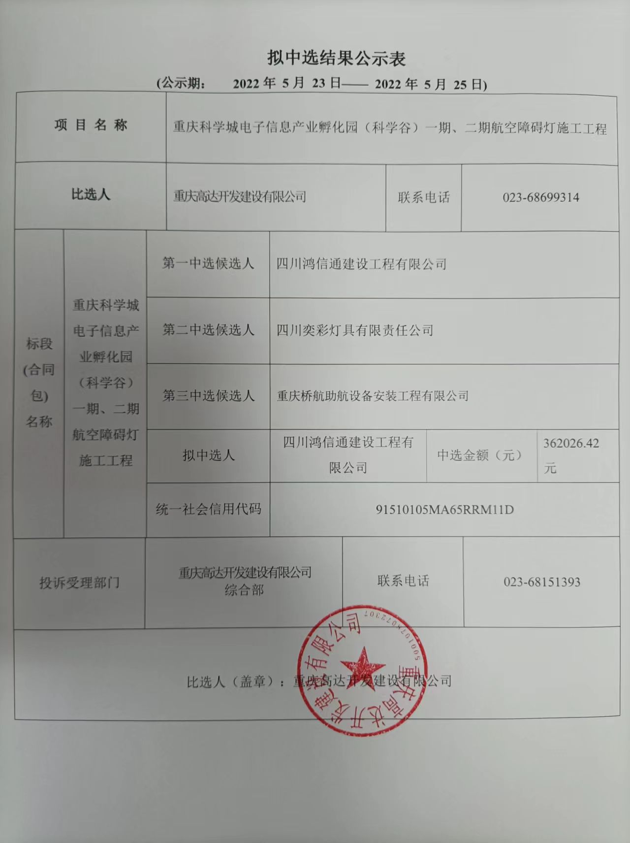 重庆科学城电子信息产业孵化园(科学谷)一期、二期航空障碍灯施工工程拟中选结果公示表