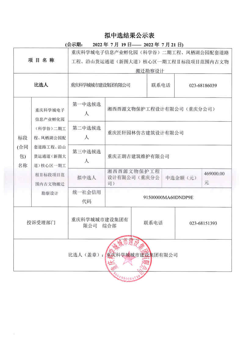 重庆科学城电子信息产业孵化园(科学谷)二期工程、凤栖湖公园配套道路工程、沿山货运通道(新图大道)核心区一期工程Ⅱ标段项目范围内古文物搬迁勘察设计拟中选结果公示表