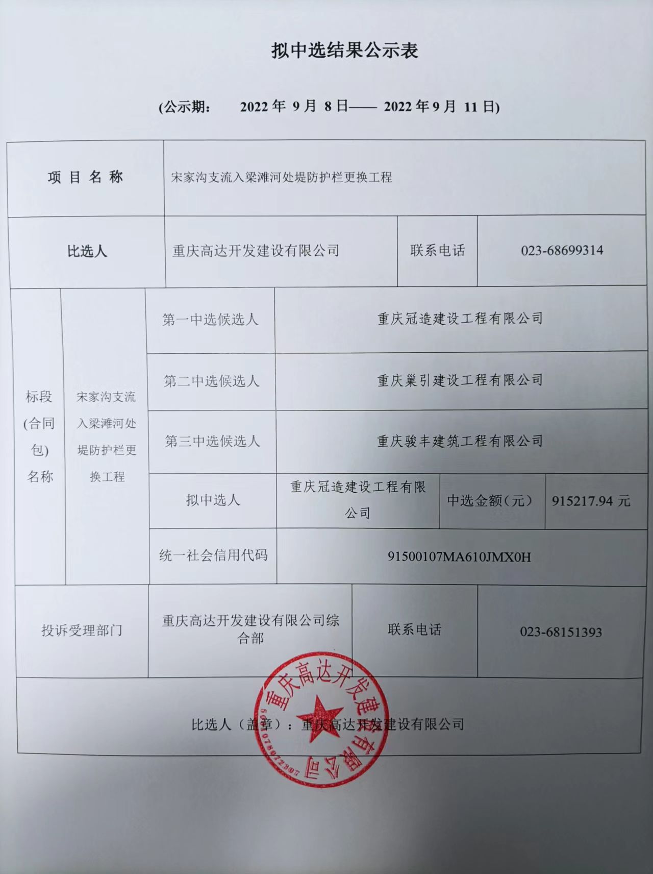 宋家沟支流入梁滩河处堤防护栏更换工程-拟中选结果公示表