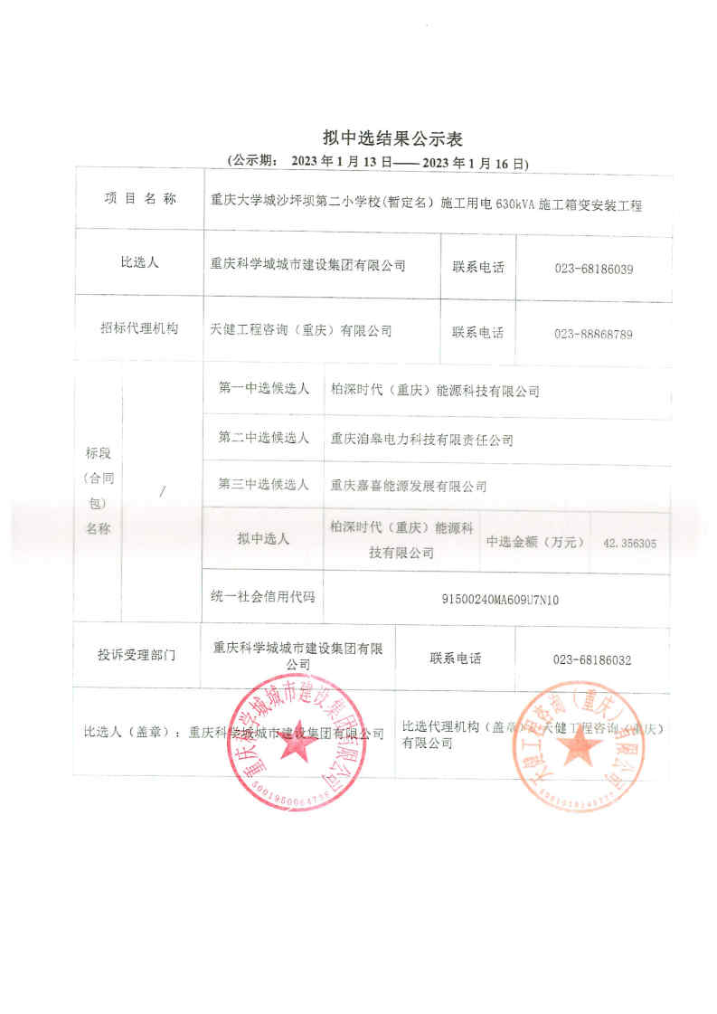 重庆大学城沙坪坝第二小学校(暂定名)施工用电630kVA施工箱变安装工程中选公示表