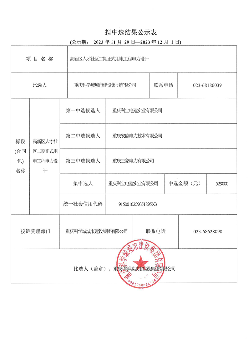 高新区人才社区二期正式用电工程电力设计拟中选结果公示