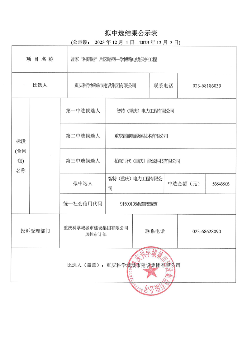 曾家“科研港”片区路网--学博路电缆保护工程拟中选结果公示