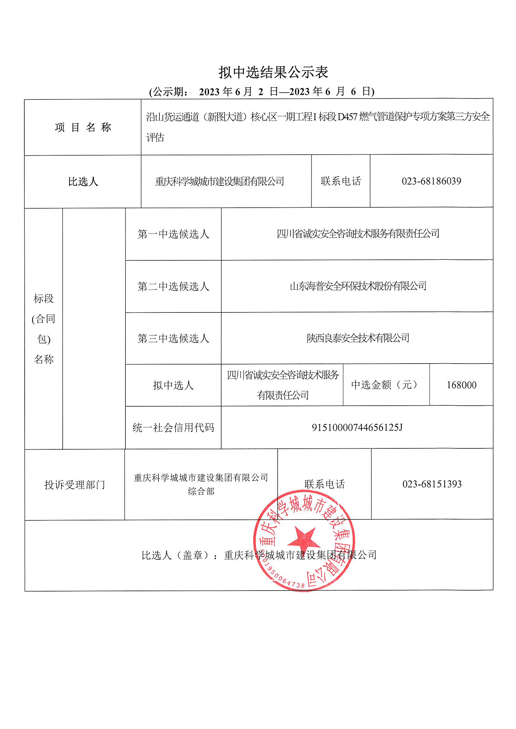 沿山货运通道(新图大道)核心区一期工程I标段D457燃气管道保护专项方案第三方安全评估拟中选结果公示表