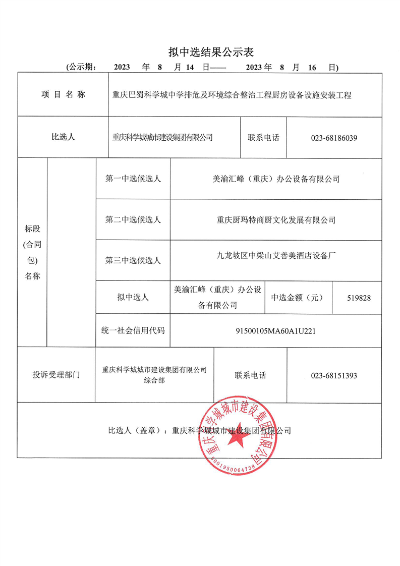 重庆巴蜀科学城中学排危及环境综合整治工程厨房设备设施安装工程拟中选结果公示表