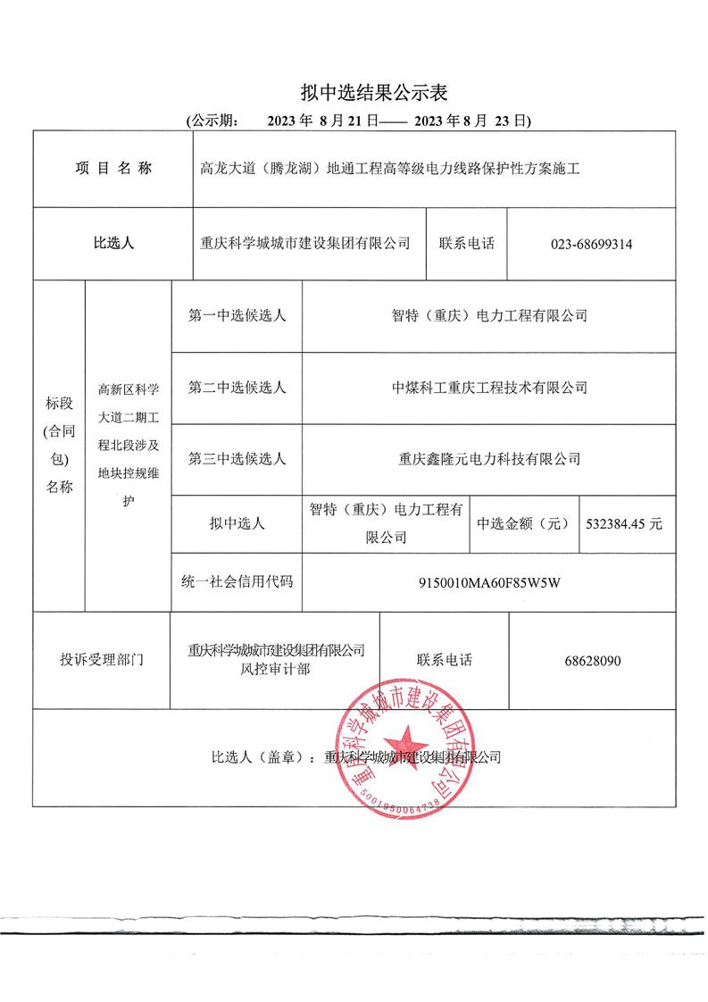 高龙大道(腾龙湖)地通工程高等级电力线路保护性方案施工拟中选结果公示表