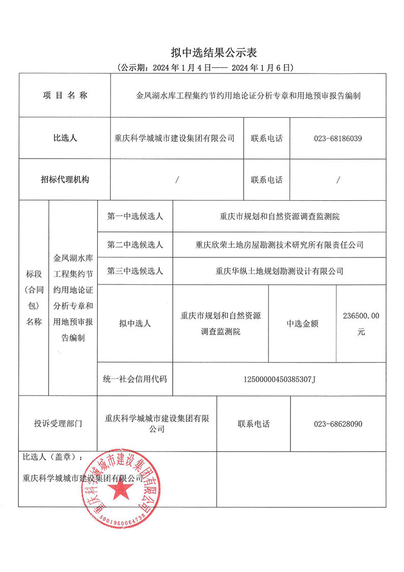 金凤湖水库工程集约节约用地论证分析专章和用地预审报告编制拟中选结果公示