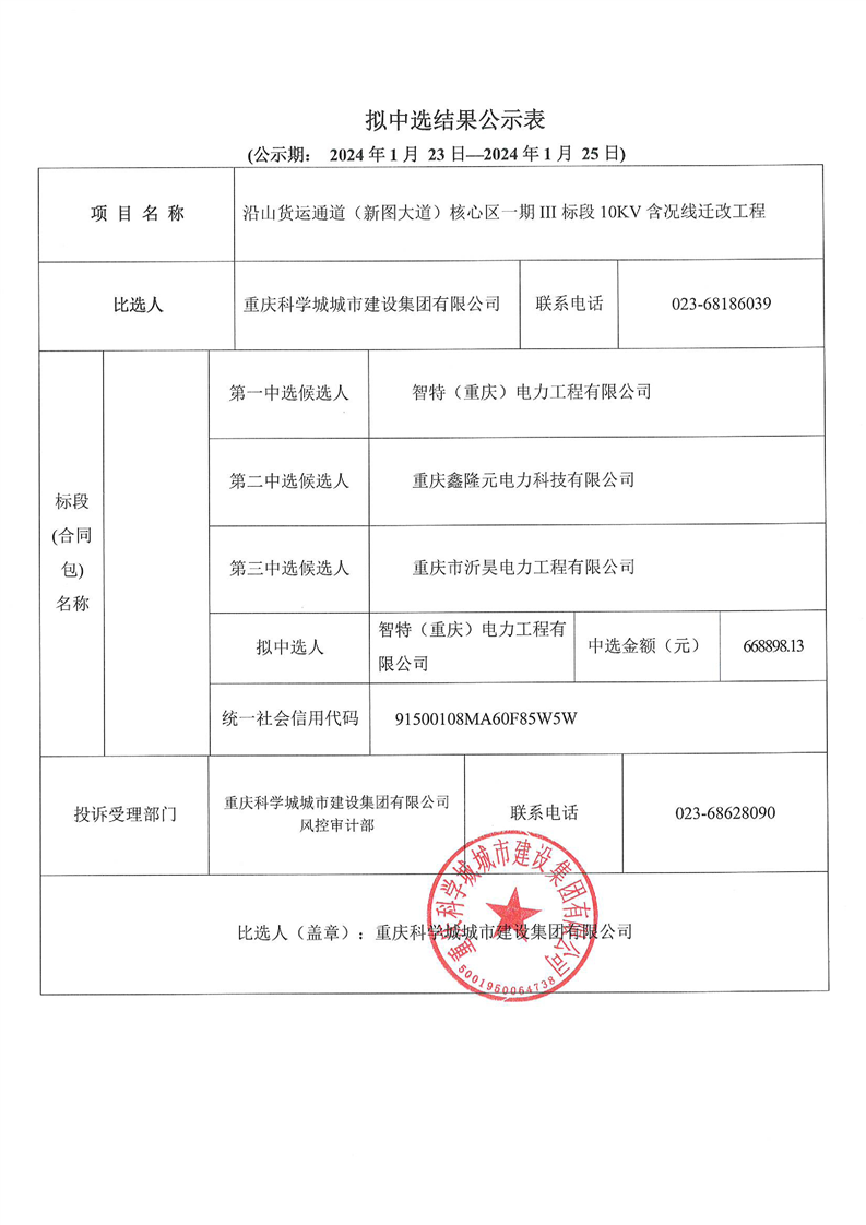 沿山货运通道(新图大道)核心区一期III标段10KV含况线迁改工程拟中选公示