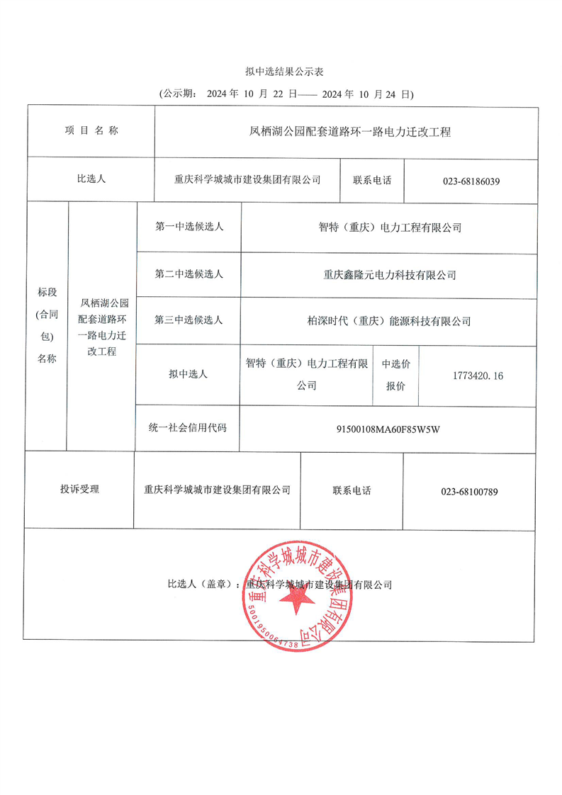 凤栖湖公园配套道路环一路电力迁改工程拟中选结果公示