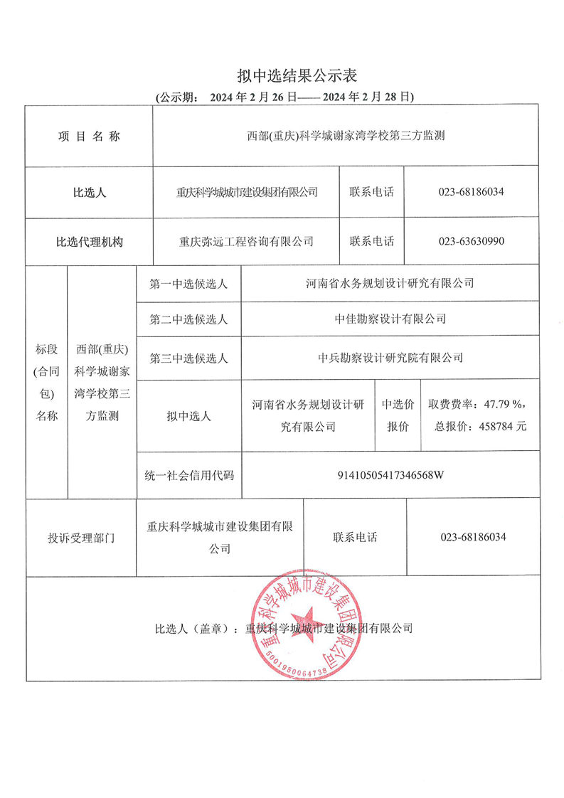西部(重庆)科学城谢家湾学校第三方监测拟中选结果公示