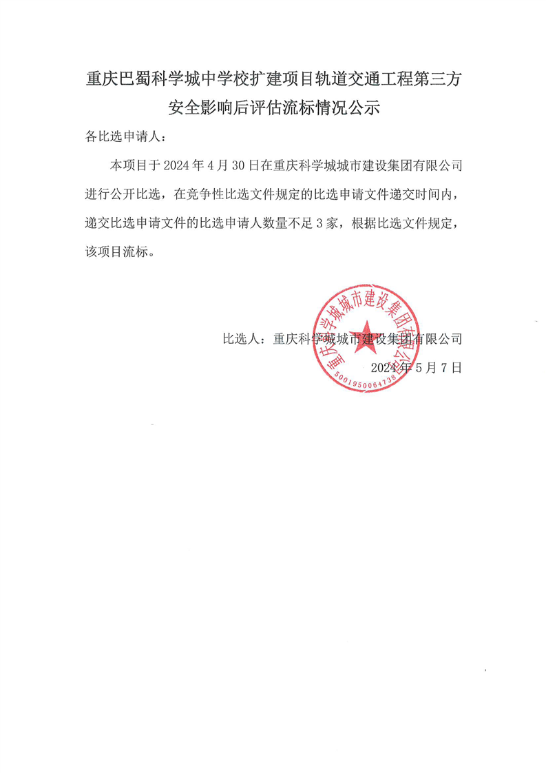 重庆巴蜀科学城中学校扩建项目轨道交通工程第三方安全影响后评估流标情况公示