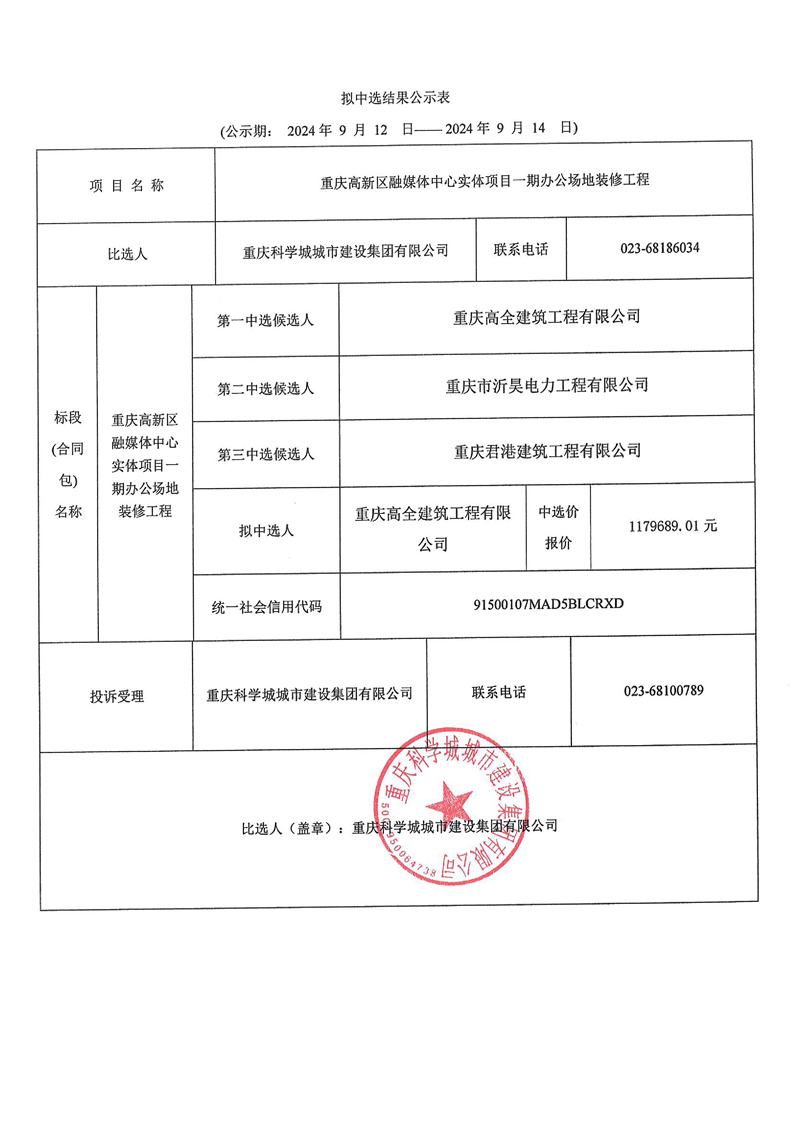 重庆高新区融媒体中心实体项目一期办公场地装修工程拟中选结果公示