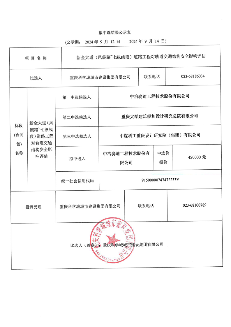新金大道(凤霞路~七纵线段)道路工程对轨道交通结构安全影响评估拟中选结果公示