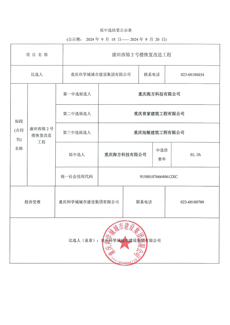 康田西锦2号楼恢复改造工程拟中选结果公示