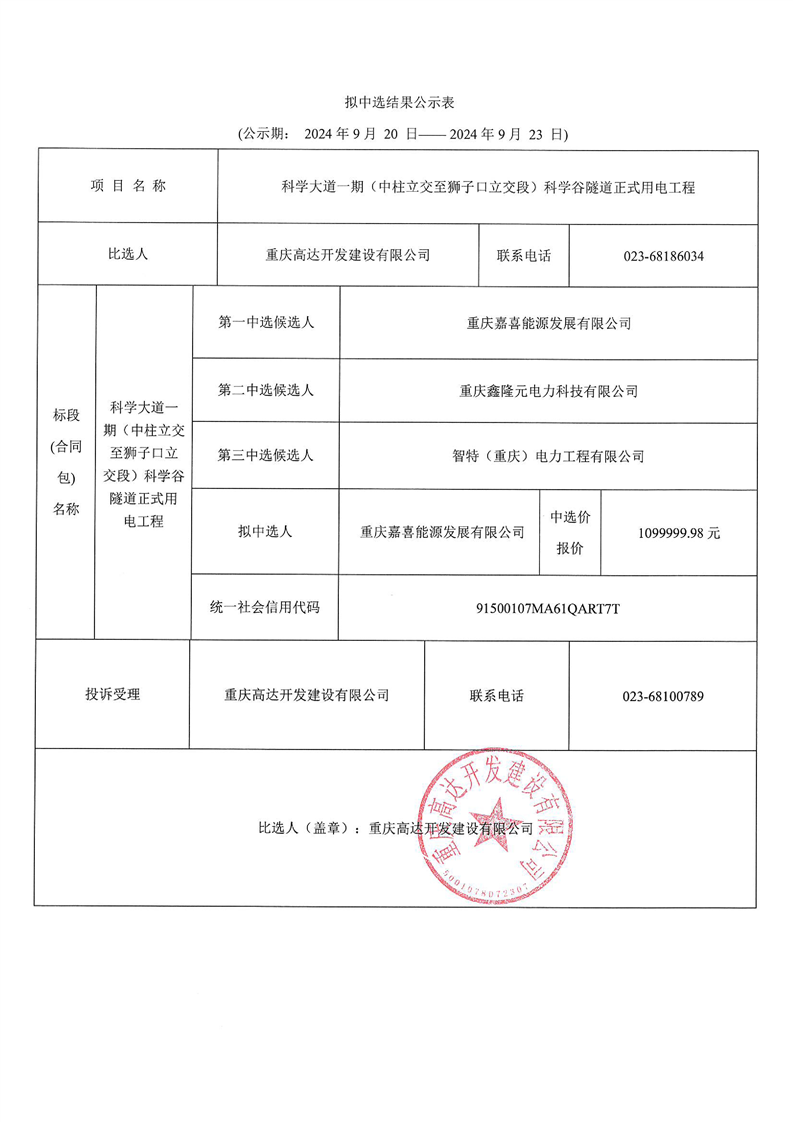 科学大道一期(中柱立交至狮子口立交段)科学谷隧道正式用电工程拟中选结果公示