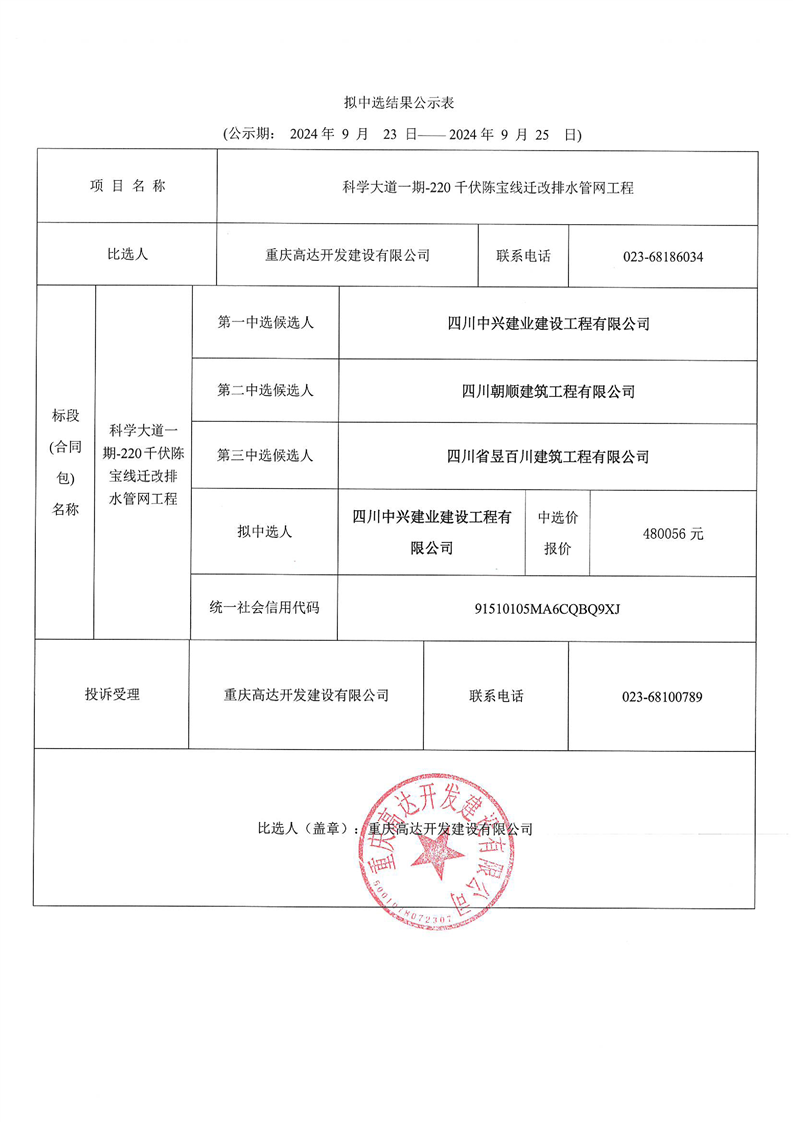 科学大道一期-220KV陈宝线迁改排水管网工程拟中选结果公示