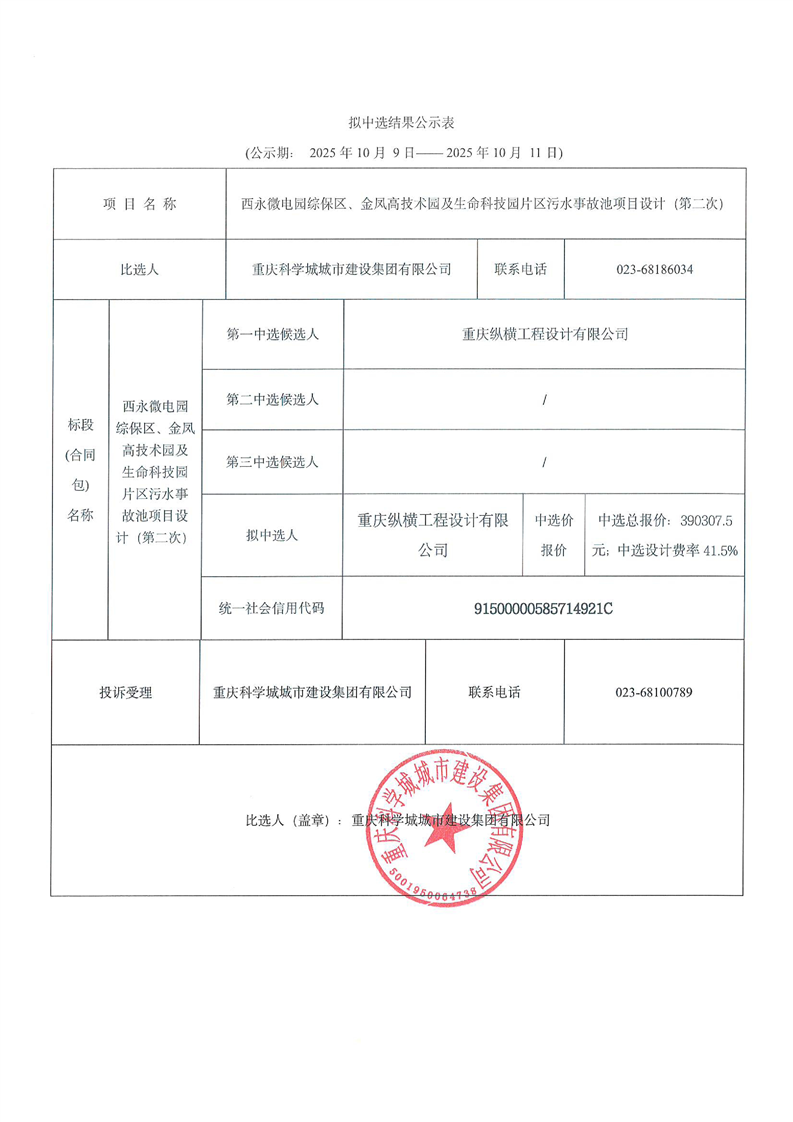 西永微电园综保区、金凤高技术园及生命科技园片区污水事故池项目设计(第二次)拟中选结果公示