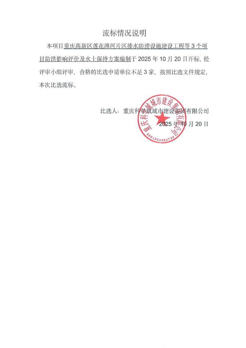 重庆高新区莲花滩河片区排水防涝设施建设工程等3个项目防洪影响评价及水土保持方案编制比选流标的情况说明