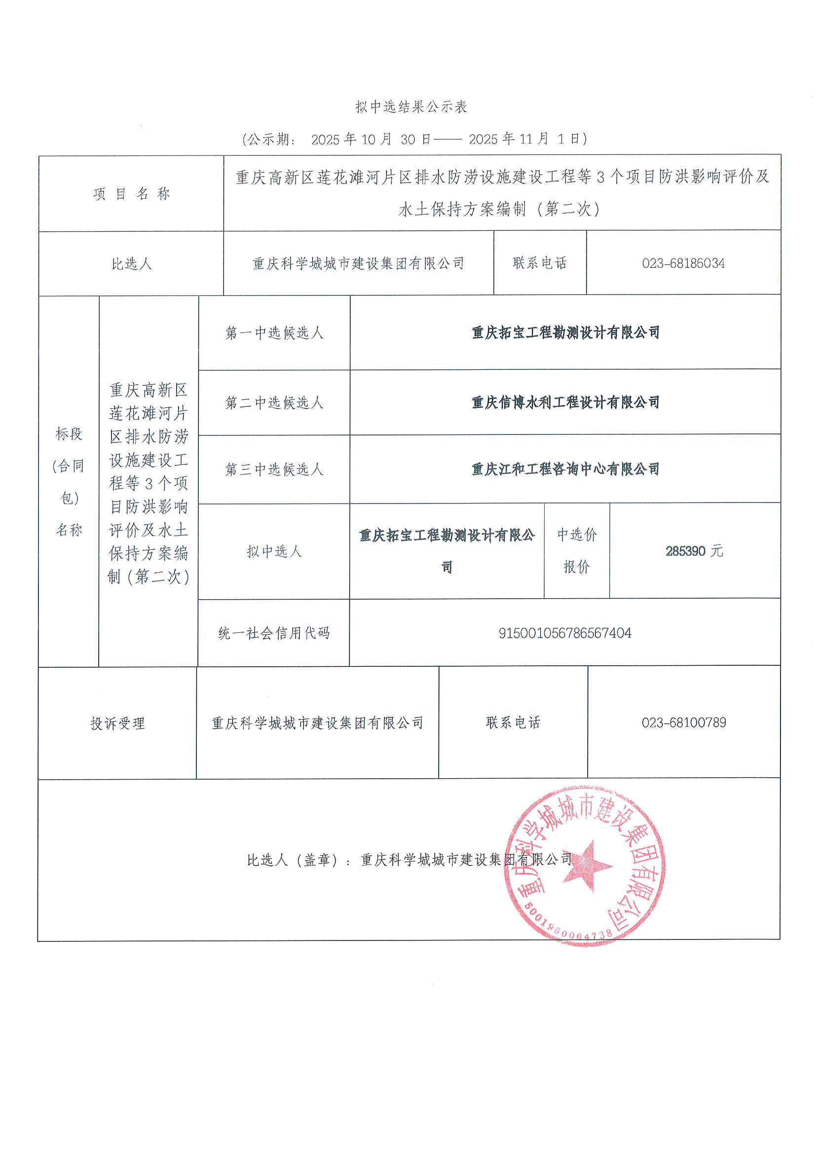 重庆高新区莲花滩河片区排水防涝设施建设工程等3个项目防洪影响评价及水土保持方案编制(第二次)拟中选公示