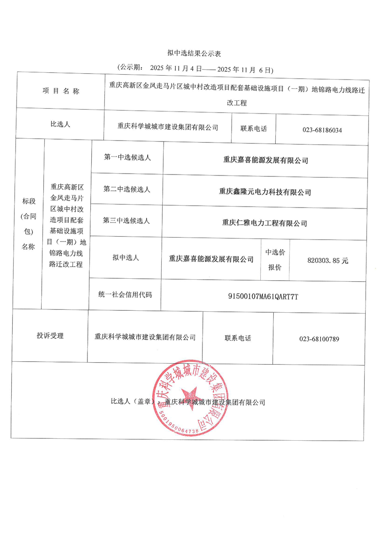 重庆高新区金凤走马片区城中村改造项目配套基础设施项目(一期)地锦路电力线路迁改工程拟中选公示