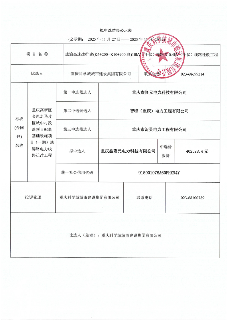成渝高速改扩建(K4+200--K10+900段)10kV线路及0.4kV线路迁改工程中选公示