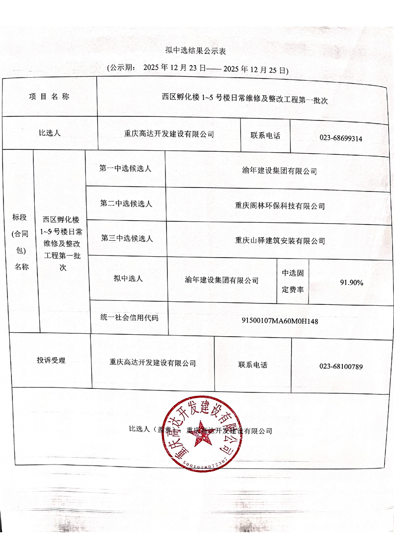 西区孵化楼1~5号楼日常维修及整改工程第一批次拟中选公示