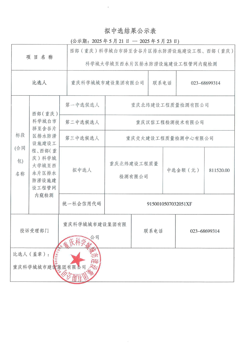 西部(重庆)科学城白市驿至含谷片区排水防涝设施建设工程、西部(重庆)科学城大学城至西永片区排水防涝设施建设工程管网内窥检测拟中选结果公示