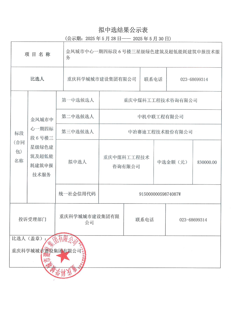 金凤城市中心一期四标段6号楼三星级绿色建筑及超低能耗建筑申报技术服务拟中选结果公示