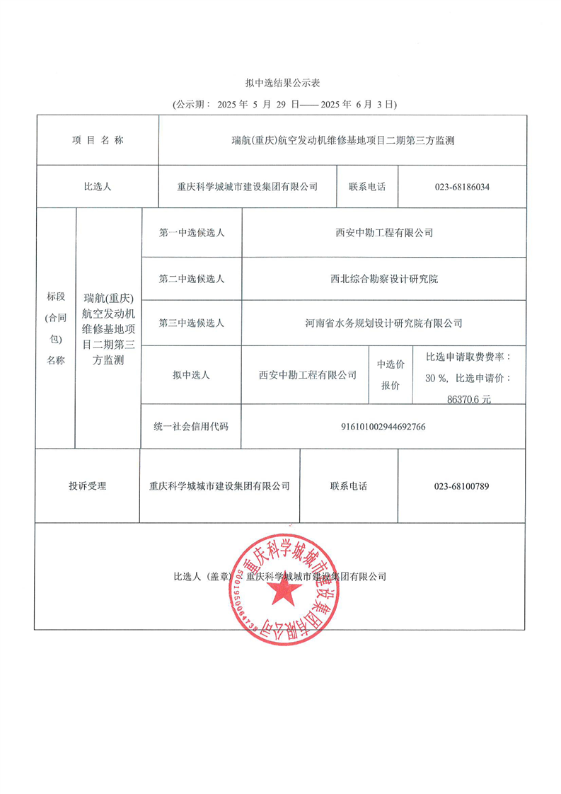 瑞航(重庆)航空发动机维修基地项目二期第三方监测拟中选结果公示