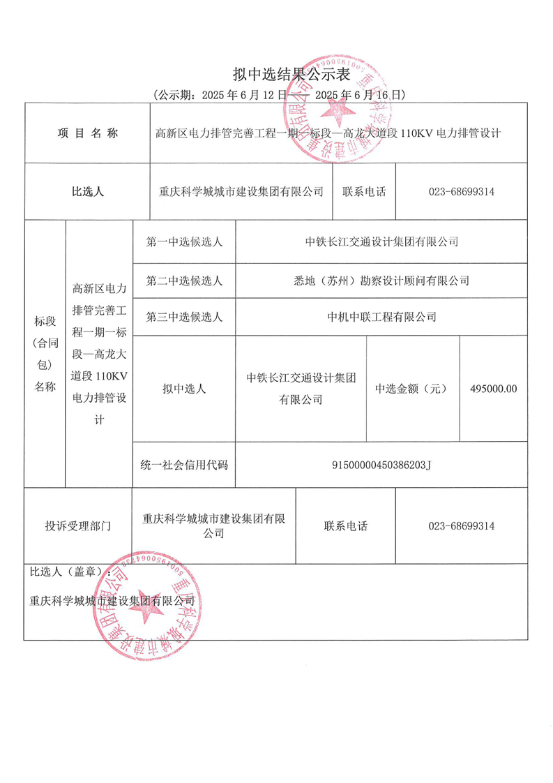 高新区电力排管完善工程一期一标段—高龙大道段110KV电力排管设计拟中选结果公示