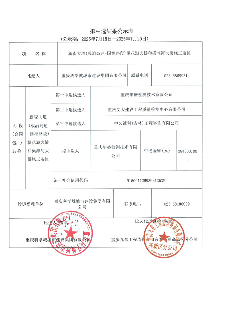 新森大道(成渝高速-国福路段)桃花湖大桥和梁滩河大桥施工监控项目拟中选结果公示