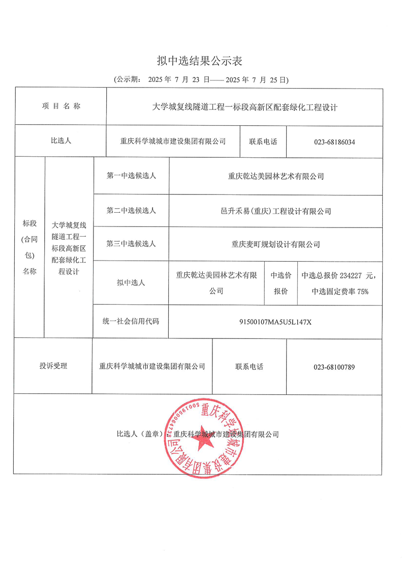 大学城复线隧道工程一标段高新区配套绿化工程设计拟中选公示