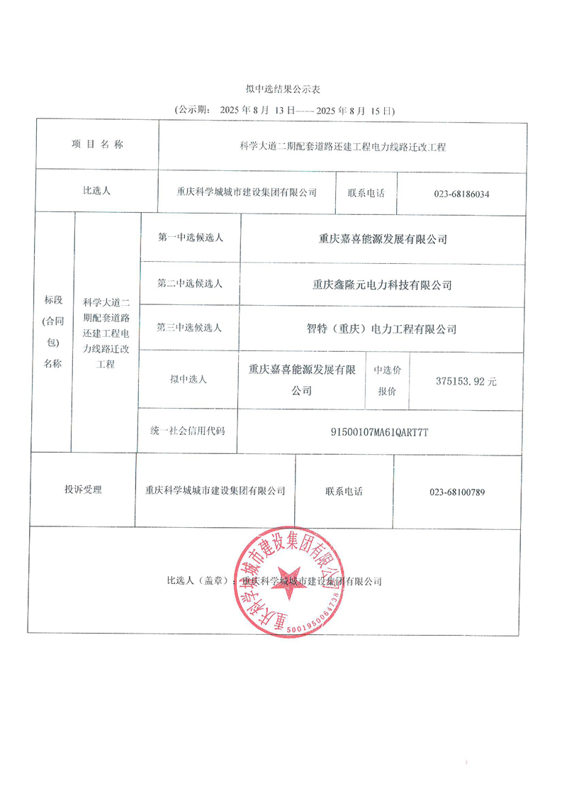 科学大道二期配套道路还建工程电力线路迁改工程中选公示