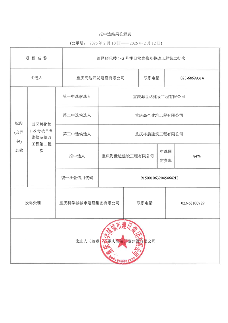 西区孵化楼1~5号楼日常维修及整改工程第二批次拟中选结果公示