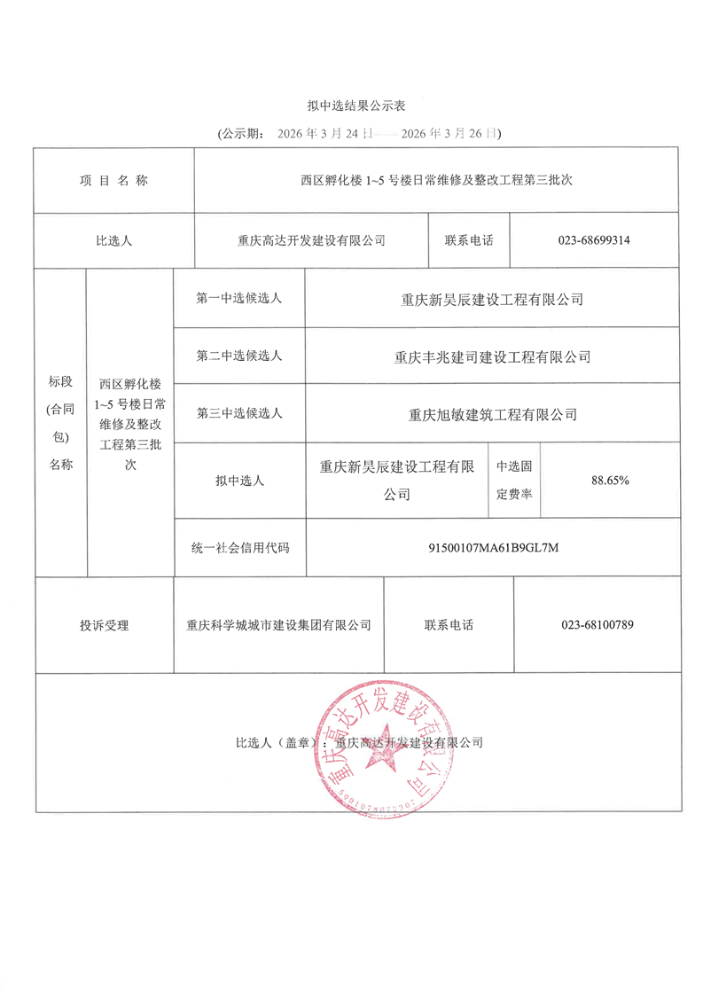 西区孵化楼1~5号楼日常维修及整改工程第三批次拟中选结果公示