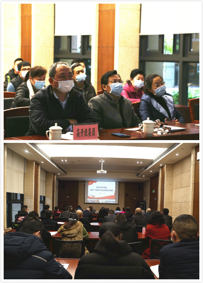 11月24日下午,重庆高新区党工委举行学习贯彻党的十九届五中全会精神市委宣讲团报告会,邀请市委宣讲团成员,重庆市社科联党组书记、副主席李保海作宣讲。高开投集团班子成员和中层干部在分会场集团公司2101会议室通过收看视频直播的方式认真学习了李保海书记关于党的十九届五中全会精神的宣讲。大家纷纷表示,将以此次学习为契机,进一步深入学习领会十九届五中全会精神,以全会精神为指导,立足岗位,积极作为,全力以赴推动科学城建设,为科学城建设成“科学家的家、创业者的城”作出积极贡献
