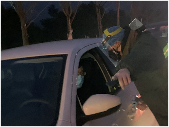天刚擦黑的时候,大学城东路的这个防疫检测点来了一辆摩托车,是外卖。突击队员迎上来,“你好,请脱下头套,配合我们测量体温。”外卖小哥边脱头套边说,“我刚刚在前面小区门口才测了,正常的,不过现在也可以再测一下”,边说边从车尾拿下来一箱饮料,“你们辛苦了,这是我的一点心意……我说嘛,温度正常的”,小哥动作很麻利,像极了加急送单子的样子,放到检测点,小哥就走了。突击队员看着小哥骑车离去的背影,说了句小哥听不见的“谢谢”!
