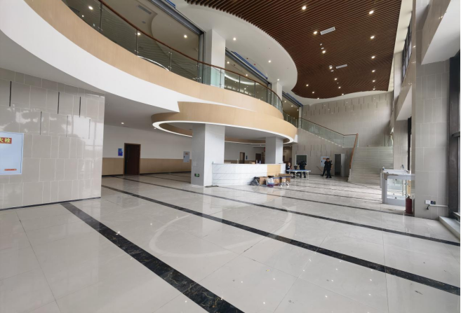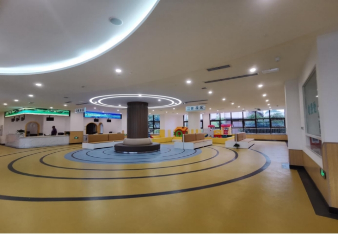 二、装修精美、人性化。在室内设计环节中,一楼门诊大厅采用了挑高层结构的中庭式设计,以中庭作为各职能部门的交通组织中枢,地面采用米白色瓷砖、仿大理石黑砖和两边木饰面相配,以简洁的黑白色与木色系列作结合,木饰面的温暖与仿大理石的清凉交相呼应,打造出一副惬意、温馨的就医空间。二楼设有疫苗接种区、中岛休息等候区及儿童游乐角,软包的中岛座椅及布局、色彩艳丽的儿童游乐设施、活泼的地面拼色与线条等,个性十足的渲染出了天使般的天地。在室外改造环节中,建筑立面进行清洁与翻新修复,广场地面满铺花岗石、主入口两侧增加了点景树和上方索拉式雨棚、室外规划了停车位等。