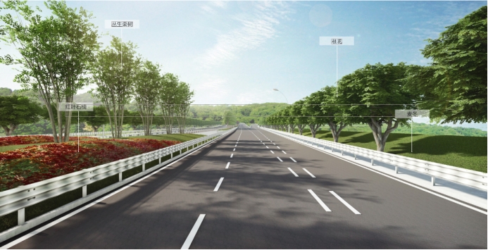“在景中建路,在路中布景”作为交通道路景观设计,力求在简洁明快的同时追求景观的韵律之美。整体景观以丛生香樟、雪松、美国红枫、丛生栾树为骨架树,以桂花为行道树,采用骨架树搭配花卉变换的方式进行植物景观营造,在馨香之中观枝芽,听风吹叶作响。车移景异,一目一景,在基调统一的基础上,不同的区段运用不同的植物进行配植。香樟郁郁葱葱,四季常青;秋桂暗淡轻黄,十里飘香,与花卉草甸错落搭配,形成不同的季相景观。