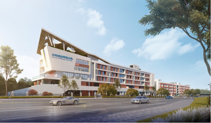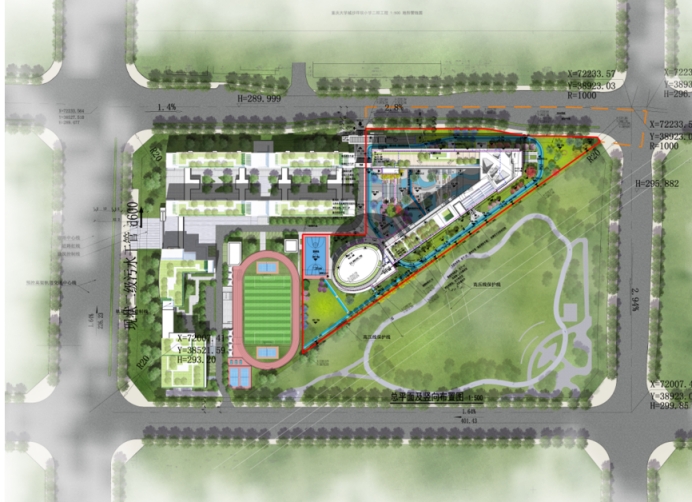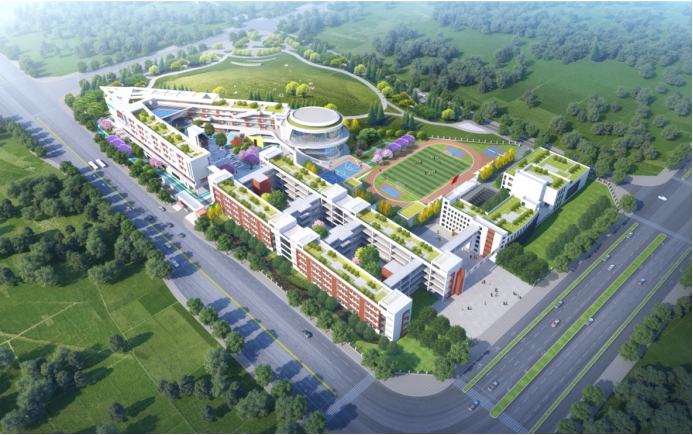 建筑设计2层架空学生活动空间,包括篮球、攀岩、器械、障碍赛、乒乓球、慢跑道等功能,慢跑道可通过外挂坡道联系上下两层架空活动空间,使学生有共多室内活动场地。平台上部为教学区,普通教室24间,专用教室18间(包含科学、创客、书法、计算机、茶艺、国画、沙画、陶艺、美术、音乐等)。南侧椭圆形建筑下部两层为食堂功能,上部为700人报告厅,用圆形为建筑点睛,使整个校园建筑规划呈现更丰富更具灵性的空间形态。