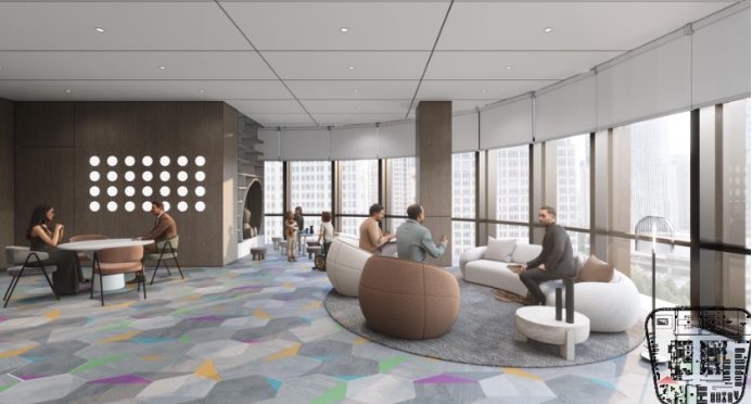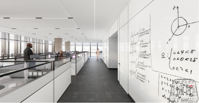 对于大规模开敞式的办公空间,设计还特别墙面的处理,给科研工作人员提供发挥灵感涂鸦的地方。(下图为开敞办公区效果图)