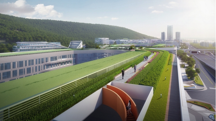 针对目前已开工的科学谷一期和二期,本次设计策略主要为美化其第五立面,展现城市风彩,塑造屋景相融,低碳环保,生态自然且安全美观的城市风貌。以科学谷为中心,辐射科学公园、科学大道、铁路防护绿地、香山公园等,回应 “一城多园“的西部(重庆)科学城建设模式。科学谷第五立面打造的三个亮点如下: