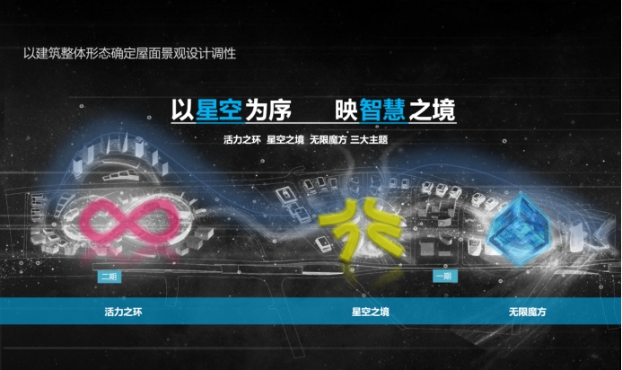 亮点一:根据园区各组团建筑特点,以活力之环、星空之境、无限魔方为主题,打造服务于科学谷不同人群的多元空间、智慧空间以及运动空间。屋顶空间又可灵活多变,根据园区主流人群需求转换功能。