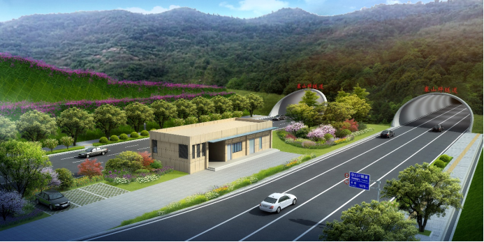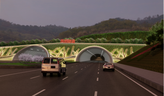 隧道洞口景观装饰结合现场自然生态环境进行专项品质提升,“取自然之形”,形而下:跨越重山,连接两地,缩短距离;形而上:万物生长,“凤栖梧桐”,意为西部(重庆)科学城可持续发展的美好寓意。