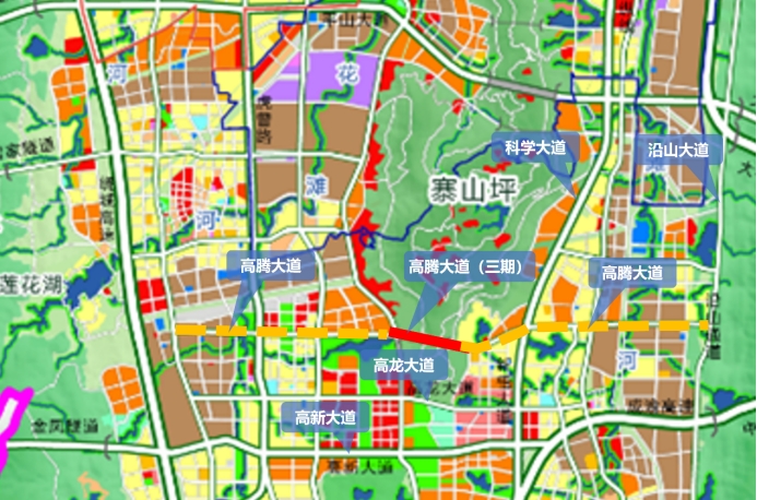 金凤含谷规划范围内道路网主要采用方格网式布局,结构性主干道形成“三横七纵”的网络。高腾大道位于高新区金凤含谷规划区内,道路东西向贯穿整个金凤含谷规划区,为“三横七纵”网络中东西横向交通主动脉。